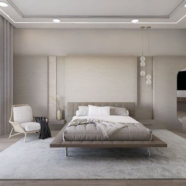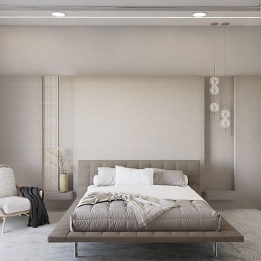 Ova spavaća soba pruža osjećaj opuštanja i udobnosti, uronjena u nijanse bež i sive koje stvaraju smirujući ambijent. Ugrađene udubine u zidovima služe kao noćni ormarići pored kreveta, dodajući praktičnost bez narušavanja elegantnog dizajna.