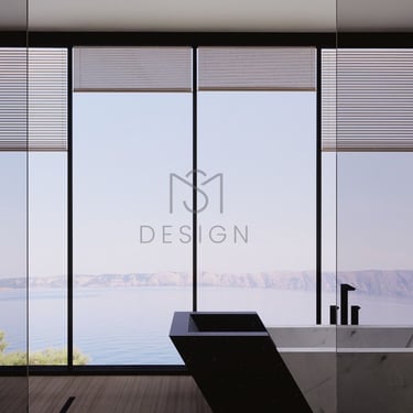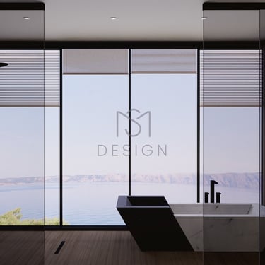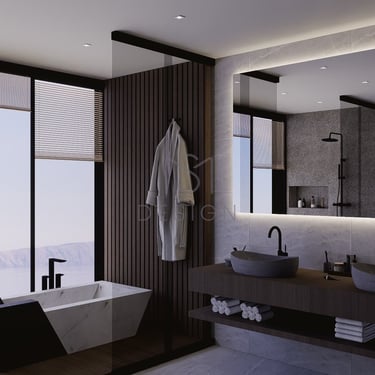Kupaonica s pogledom na more pruža savršenu oazu mira, kombinirajući prirodne drvene i kamene elemente za luksuzan i opuštajući ambijent. Mramorna kada dodaje luksuzan dodir, dok kameni umivaonici unose organski osjećaj u prostor. Tuš i kada su elegantno spojeni, pružajući i stil i praktičnost.
