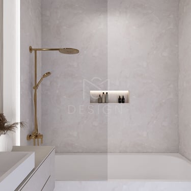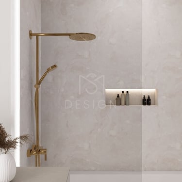 Zlatni elementi, uključujući tuš, slavinu i zidne lampe, dodatno naglašavaju luksuzan dojam, dok neutralne bijele i bež nijanse, s akcentima zlatne, stvaraju osjećaj topline i luksuza.