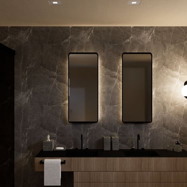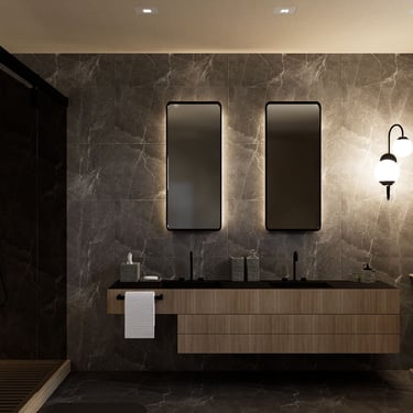 Ova tamna kupaonica stvara elegantan i opuštajući prostor. Tamnosive pločice unose suvremeni štih, dok bež zidovi dodaju toplinu. Topla rasvjeta stvara ugodnu atmosferu i ističe teksturu pločica. Dva pravokutna ogledala iznad umivaonika dodaju simetriju i praktičnost prostoru.
