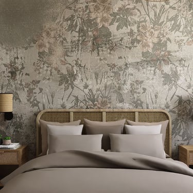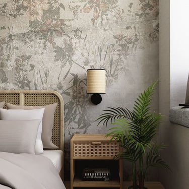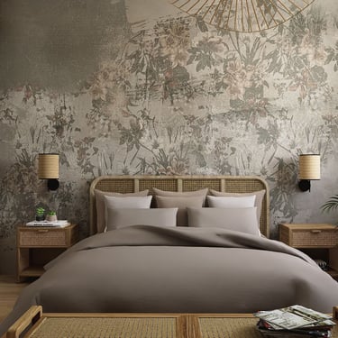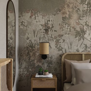 Središnji dio zauzima udoban krevet s uzglavljem od pletenog drva, dodajući rustikalni šarm. Zid iza kreveta obložen je tapetama s floralnim uzorkom, unoseći dašak prirode. Drveni noćni ormarići s jednostavnim lampama pružaju toplu i ugodnu svjetlost.