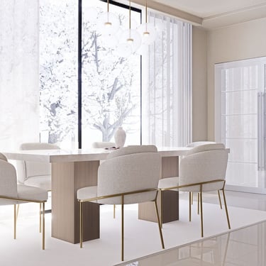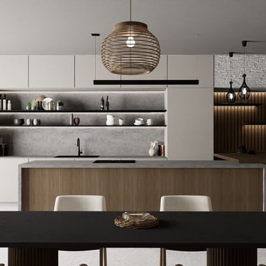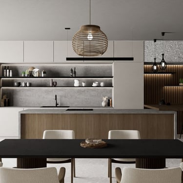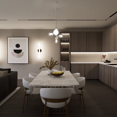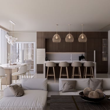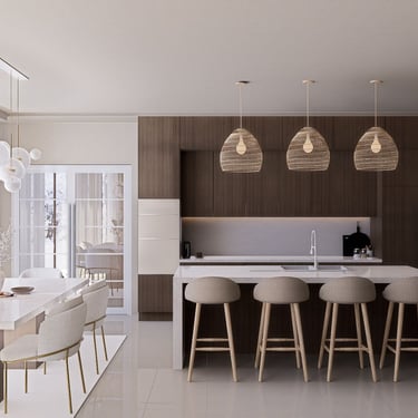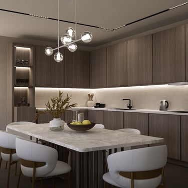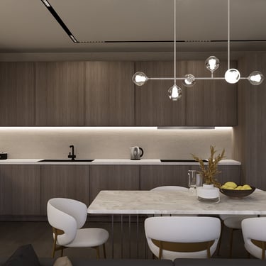 U kuhinji, drveni elementi pružaju toplinu i karakter prostoru, dok mramorni otok i blagovaonski stol dodaju eleganciju. Bijele stolice sa zlatnim nogama upotpunjuju luksuzan izgled. Ova kombinacija stvara skladan i ugodan ambijent za opuštanje i druženje.