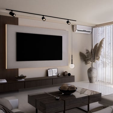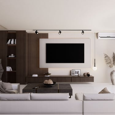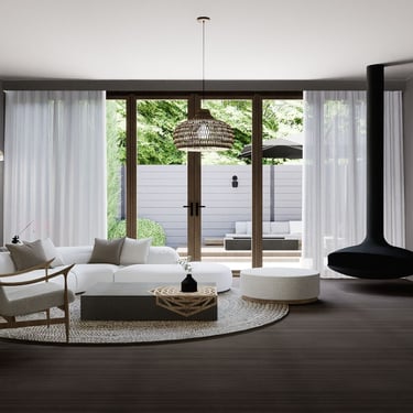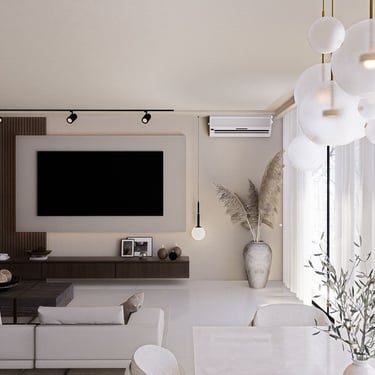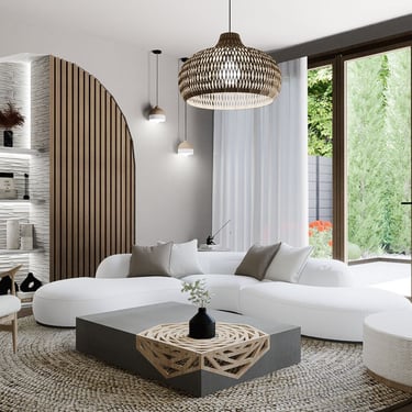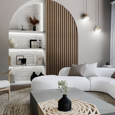 U ovom dnevnom boravku, spoj modernog boho stila nudi udobnost i suvremenost. Drveni elementi ističu se u prostoru, dodajući toplinu i prirodnu teksturu. Okrugli tepih definira prostor i pridonosi udobnosti, dok polukružni otvor na zidu kombinira funkcionalnost i dekorativnost kao prostor za knjige i sitnice.
