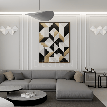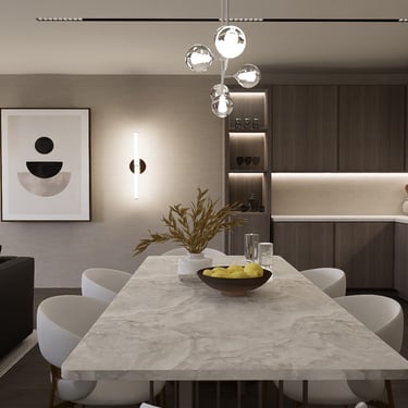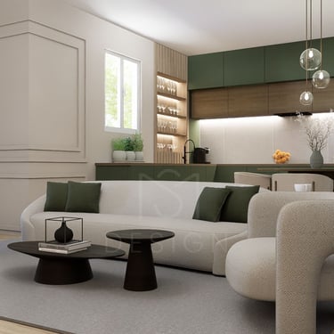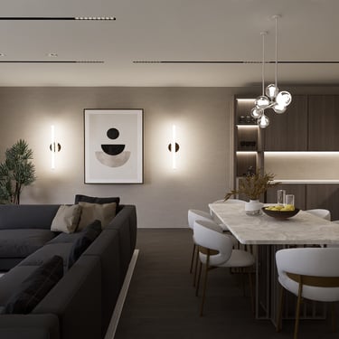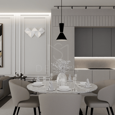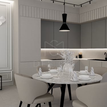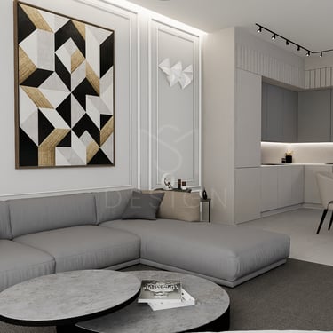 U ovom spojenom dnevnom boravku i kuhinji vlada elegancija i sofisticiranost. Zidovi su obogaćeni štukaturama, dok slika na zidu donosi umjetnički izraz i razbija monotoničnost boja.