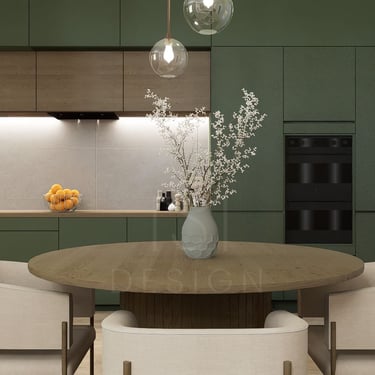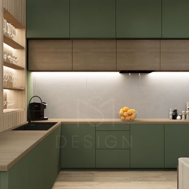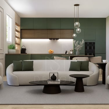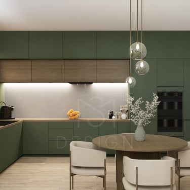 Spojeni dnevni boravak i kuhinja predstavljaju harmoniju modernog dizajna i prirodnih elemenata, stvarajući prostor koji odiše toplinom i svježinom. Kuhinja je obložena frontama zelene boje, što unosi dašak prirode i osvježava prostor. Zeleni tonovi savršeno se stapaju s drvenim elementima, poput kuhinjskih ormarića i radnih ploha, stvarajući ugodan i opuštajući ambijent.
