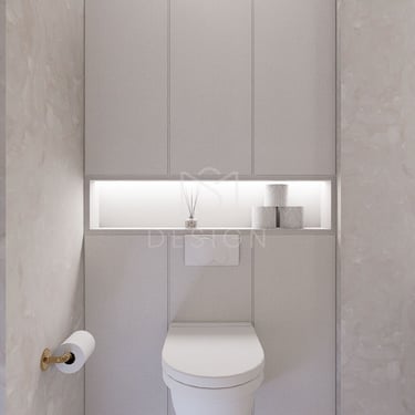 Ova moderna kupaonica od 5 m² odiše sofisticiranošću i elegantnim dizajnom. Zidovi su obloženi svijetlim pločicama s nježnim uzorcima, što prostoru daje prozračan i svjež izgled. Iznad umivaonika je vertikalno postavljeno ogledalo s integriranim LED osvjetljenjem, koje osigurava dovoljno svjetla i vizualno proširuje prostor.