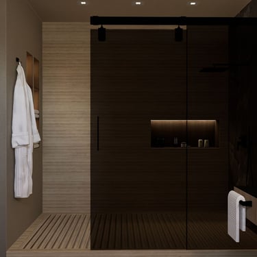 Tuš s drvenim podom i zidom donosi prirodan element, a zatamnjeno staklo osigurava privatnost i eleganciju.