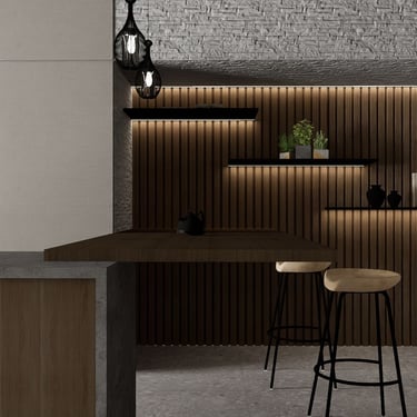 Ovaj spojeni dnevni boravak i kuhinja stvaraju prostor obilježen toplinom i prirodnim izgledom. Veliki kauč tamno sive boje pruža udobnost u dnevnom boravku, dok crni stolić dodaje eleganciju.