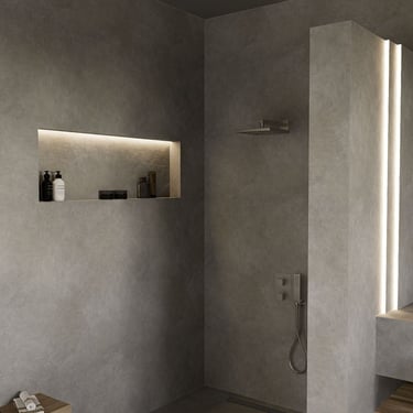 Ova kupaonica zrači elegancijom i suvremenim stilom zahvaljujući sivoj kamenoj površini koja dominira prostorom. Svaki detalj pažljivo je osmišljen s naglaskom na estetiku i funkcionalnost. LED svjetla na pregradi tuša pružaju dozu luksuza, dok biljka unosi svježinu i povezanost s prirodom.