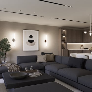 Paleta boja u nijansama sive, bež, crne i bijele stvara harmoničan sklad prostora. Svaki element, od namještaja do dekorativnih detalja, doprinosi eleganciji i suvremenom dojmu prostora.